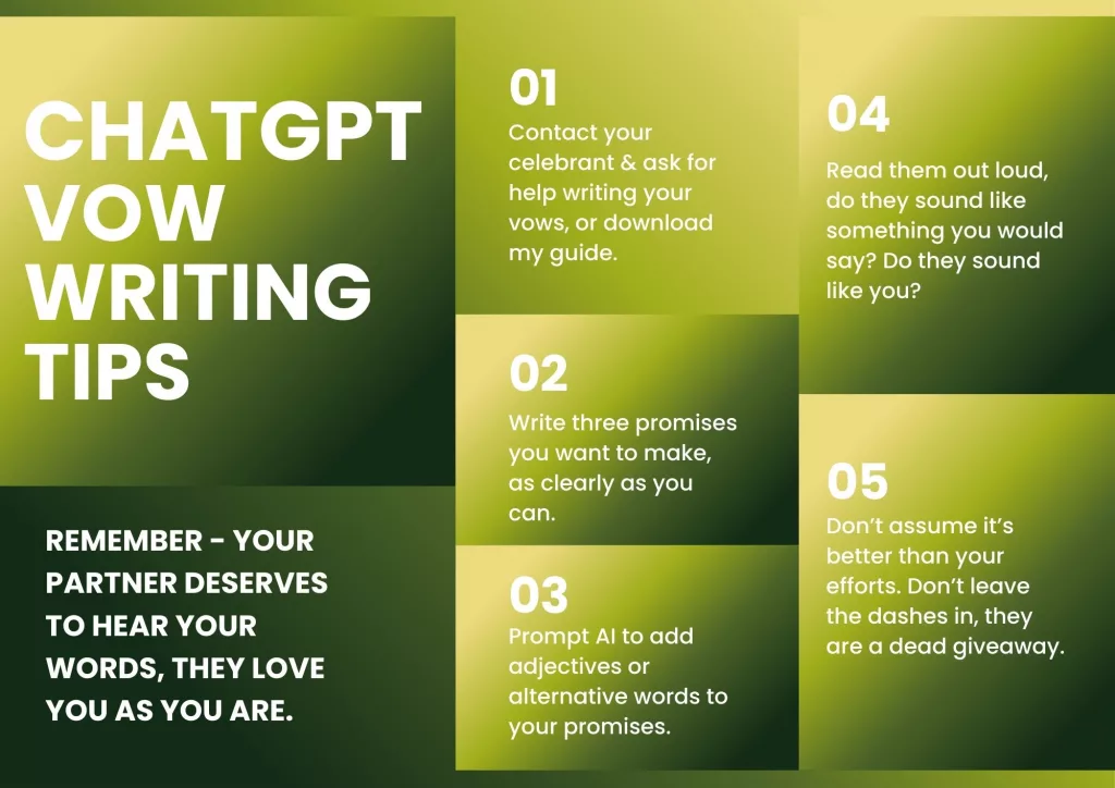 I think people would expect me to say using AI to write your vows is an abomination, particularly if you have paid a celebrant like me to write you a very personal ceremony, and I never, never use AI. However, I get the temptation, and I totally get the confidence boost that people think AI gives them about the quality of their emotional writing.