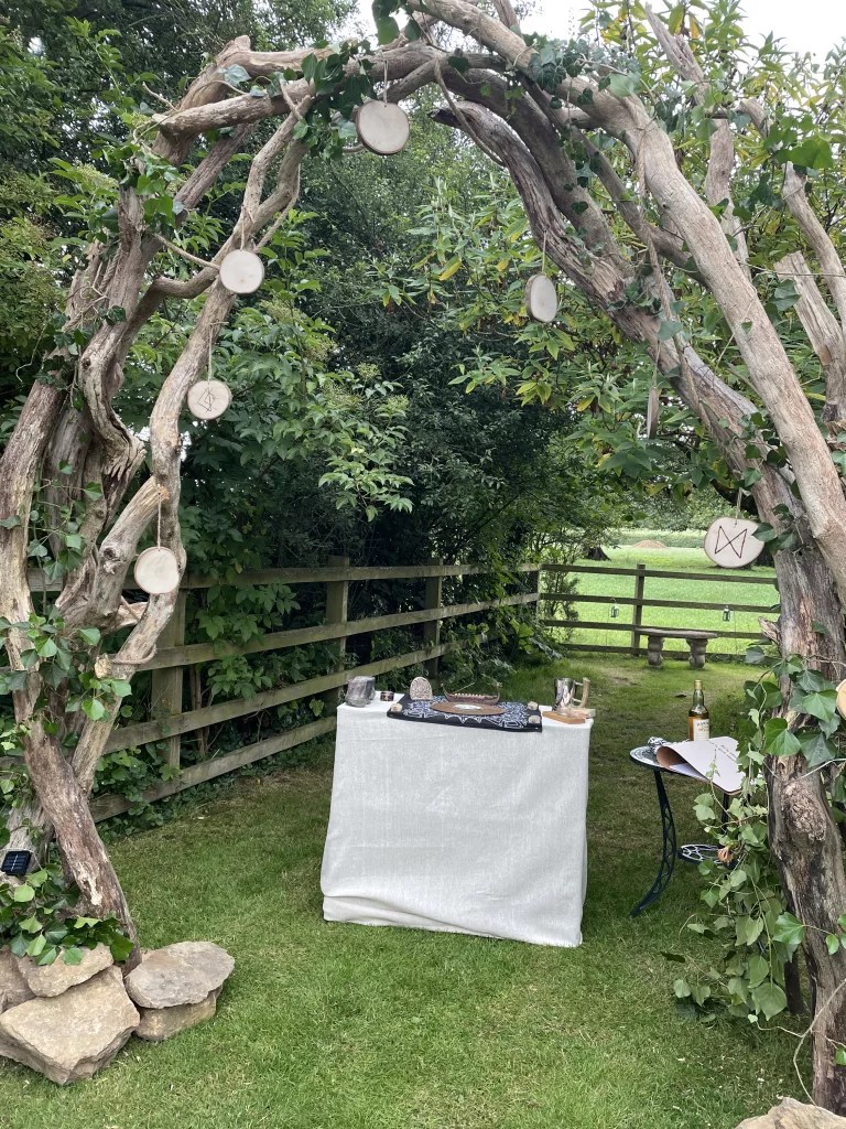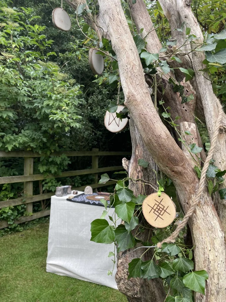 Norse Paganism is rooted in natural surroundings and the garden was a perfect spot. Jen and Leifr had created a natural archway with wood and greenery which was adorned with carved wooden rune decorations. I was so happy when I arrived with my gift to them of a rune symbolising luck to be able to add it to the archway!