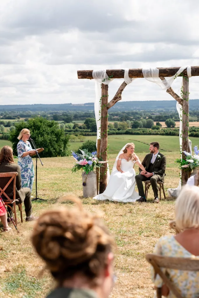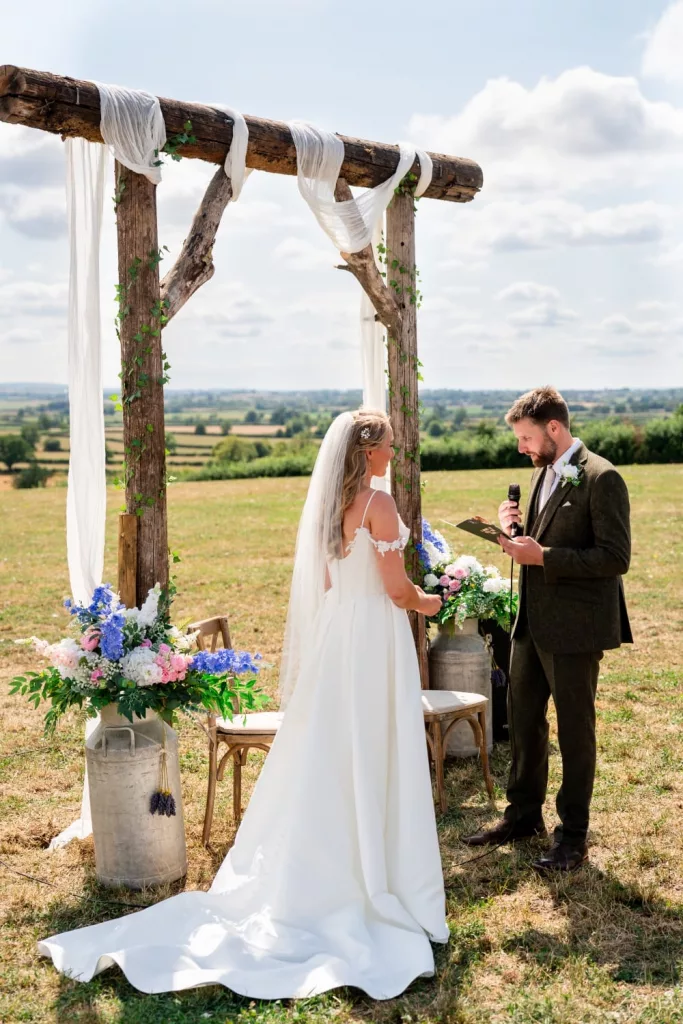A wedding ceremony at the highest point of their own land, looking down on the Wiltshire Plains. Guests arriving by tractor and trailer to a ceremony space filled with flowers. A sailcloth marquee packed with games, personalised cocktails named for their beloved dogs. Hay bales and sunshine and happy tears in the wind as they exchanged their wedding vows. Luke and Danielle’s celebrant wedding ceremony on their farm in Wiltshire was a joyous riot of fun from start to finish!