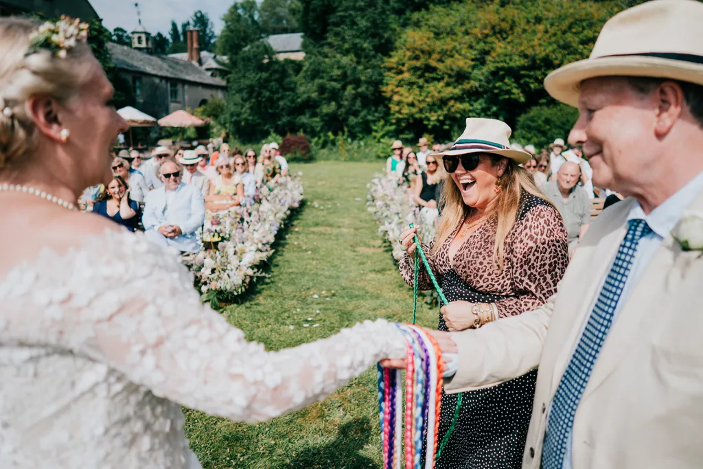 They wrote their own, very moving personalised wedding vows, and at the end of the ceremony we had a dream of a hand fasting – friends and family who had special meaning to Linda and Rod encircled them one by one and added a specially chosen cord each, whilst I talked about what each person meant to them. I tied the knot for them and they pulled it tight, and then danced back down the aisle together and off into the party as we all cheered and joined in. It was incredibly powerful to see their lives bound up in those wonderfully colourful cords.