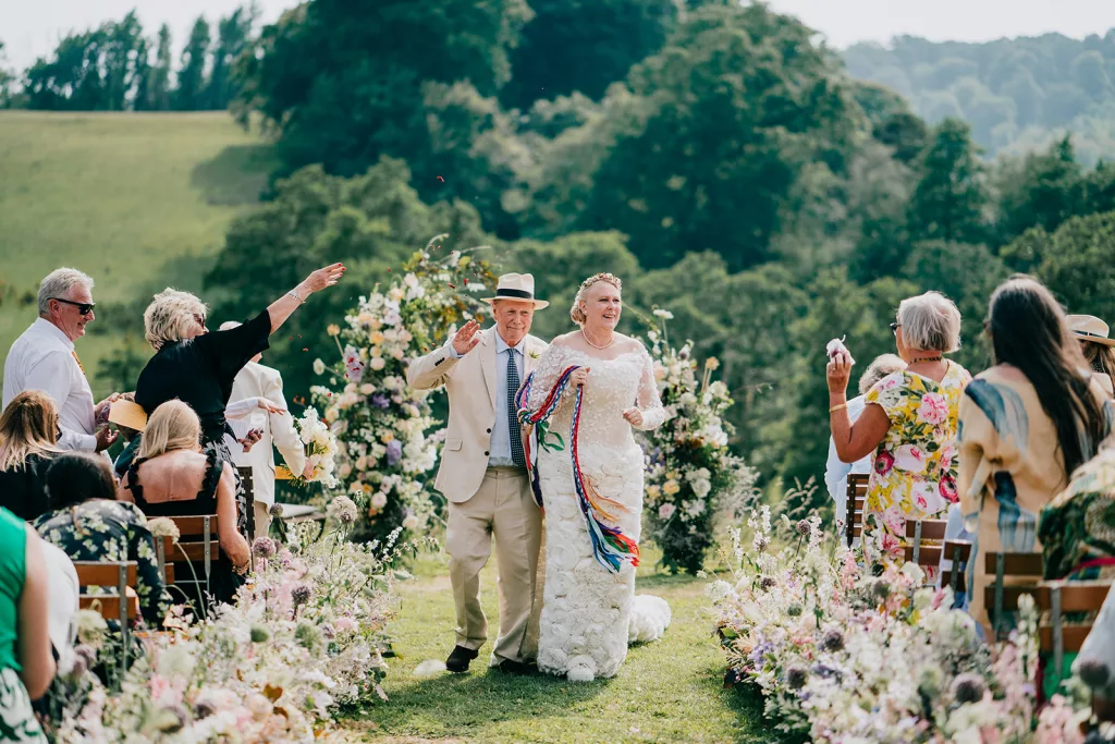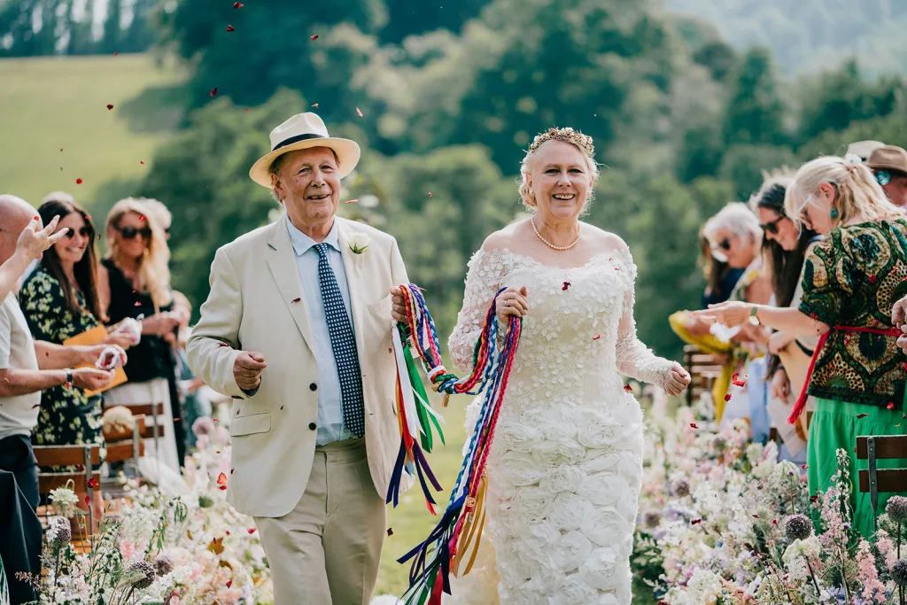 When you’ve been together for 43 years, you have an incredible love story to tell. You need a Devon wedding celebrant to do it justice. And when you’re Linda and Rod, and you scream decadent, eloquent, romantic luxury, you need a venue like The Pig at Combe. In the glow of a perfect June summer solstice day, we gathered for their wedding ceremony on the lawn, surrounded by a meadow of flowers. Theirs was a quintessential English wedding day, with maximalist stylistic touches, a deeply personal celebrant wedding ceremony, and a huge, huge party. It was spectacularly beautiful in every way.